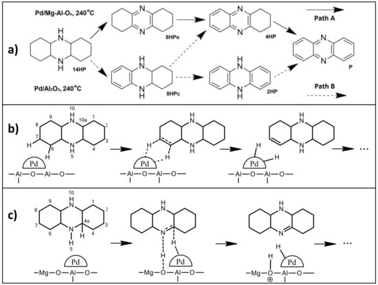 Based on the GC data and the previously reported results [,,,,], the following reaction mechanisms were suggested for the first stage of 14HP dehydrogenation (Figure 7b,c). According to the proposed mechanisms, dehydrogenation over Pd/Al2O3 occurs in one stage via the abstraction of two hydrogen atoms by a Pd nanoparticle (Figure 7b). In this case, both hydrogen atoms must be oriented in roughly the same direction towards the Pd nanoparticle, which is apparently possible only for the side ring due to the sterical problems. Over supports containing Mg, strong basic sites can participate in the hydrogen abstraction (Figure 7c). In this case, one hydrogen atom is initially abstracted by a basic site, whereas the second atom is taken by a Pd nanoparticle in the following step. Thus, the sterical problems are removed, and the dehydrogenation process can follow the most energetically favorable pathway. In both cases, the eventual coupling of the hydrogen atoms yields molecular hydrogen.