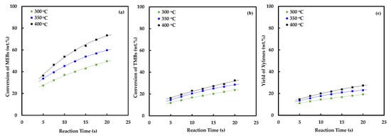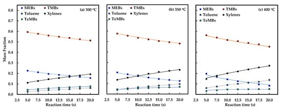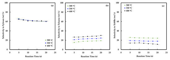 The changes in the selectivity to xylenes, toluene and TeMBs versus reaction time and temperature is presented in Figure 2. The selectivity to xylenes is quite high (60–65 wt.%), but it changed very little with reaction time or temperature. Although the conversion of C9 aromatics as well as the yield of xylenes increased with reaction time and temperature, as shown in Table 1, the selectivity of xylenes remained almost unchanged. In contrast, the selectivity of toluene increased with both the reaction time and temperature. It increased from about 19 wt.% at 300 °C to 30.3 wt.% at 400 °C after 20 s. It should be noted that toluene is simultaneously produced by the dealkylation of MEBs and consumed in the transalkylation reaction. Similarly, the TeMBs are also produced by the disproportionation of TMBs and consumed in the paring reaction. The selectivity of TeMBs, however, decreased with reaction temperature, because the dependency of the rate of paring reaction on temperature is higher.