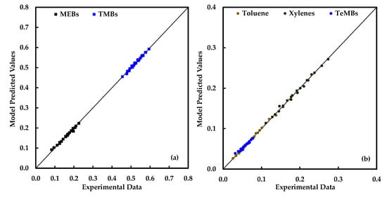 Figure 4 compares the experimentally obtained composition of products obtained at various reaction times and temperatures with those predicted by the kinetic model. The plots shown in this figure confirm that the model prediction is very close to the experimental values. The parity plots of the reactants and products presented in Figure 5 further confirm the accuracy of the kinetic model. The correlation coefficients for MEBs, TMBs, toluene, xylenes and TeMBs were 0.9892, 0.9906. 0.9926, 0.9877 and 0.9242, respectively. The lower value of the correlation coefficient for TeMBs can be attributed to the possibility of other reactions involving TeMBs. Moreover, the relative amounts of TeMBs in the product are much lower than other products, which could amplify the error in estimation.