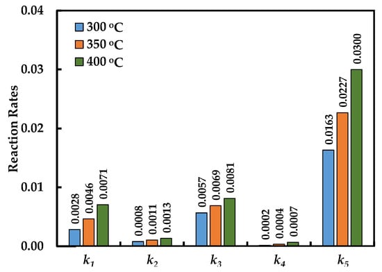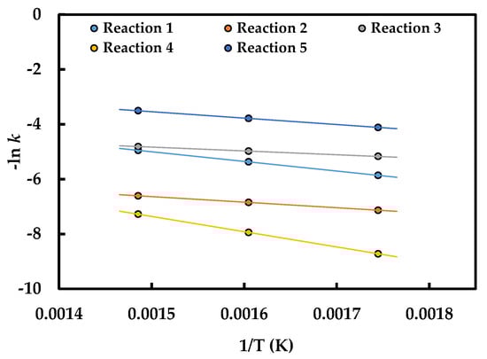 The reliability of the estimated kinetic parameters was confirmed by the negative slopes of the Arrhenius plots for the individual reaction rate constants, as presented in Figure 6 (for k1, k2, k3, k4 and k5). The error bars in this figure represent the range of -lnk values calculated from the 95% confidence limits of activation energies.