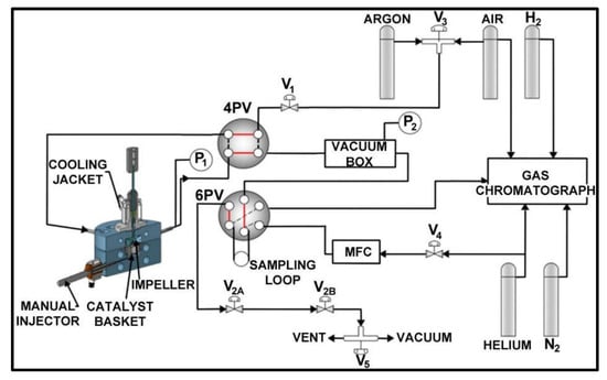 Experiments to generate catalyst performance data for kinetic modeling were conducted in a CREC Riser Simulator, which is a fluidized batch reactor [22]. Figure 8 shows the schematic of the components of the riser simulator including the body of the reactor unit, impeller, and catalyst basket. The complete experimental setup is presented in Figure 9 [23]. This fluidized reactor system facilitates very short reaction times (5–20 s) and the accurate control of reaction conditions. The internal and external mass transfer restrictions were eliminated due to the very small size of catalyst particles (15–110 μm) and intense mixing, respectively. The volume of the reactor is 50 cm3, and the volume of the vacuum box is 1000 cm3.