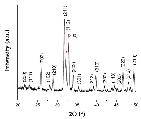 The nat-HA XRD pattern was acquired and recorded on a D8 Advance Bruker X-ray diffractometer (Karlsruhe, Germany) using Cu Kα radiation at a 2Ɵ angle ranging from 20° to 50°. With the aid of JCPDS files, the phases were identified. Fourier-transform infrared (FT-IR) spectra were recorded on a Perkin Elmer FT-IR-300 spectrometer (Japan) using the KBr pellet technique with a scan range of 400–4000 cm−1. The morphology of the powder was examined with scanning electron microscopy SEM, Philips XL 30 (Eindhoven, The Netherlands). In order to better understand the adsorption mechanism of the CIP antibiotic, the point of zero charge (pHPZC) of natural hydroxyapatite was determined [61].