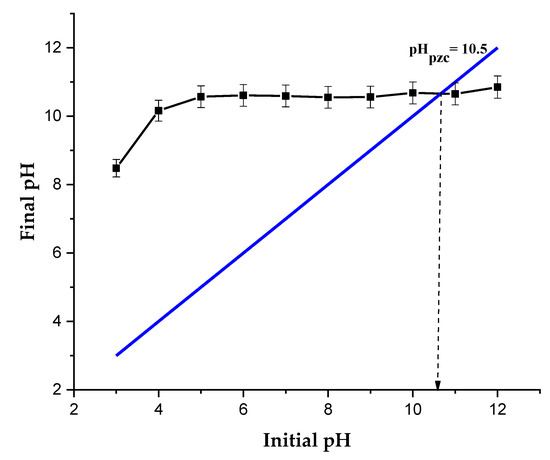 Over the broad pH range of 3–12, the surface charge of the nat-HA adsorbent was examined. Based on Figure 4, the pHPZC of nat-HA was determined to be 10.5.