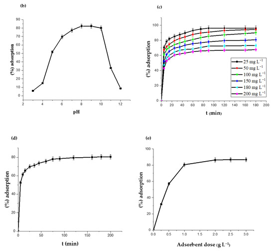 In adsorption studies, antibiotic concentration is an important variable to investigate, as most contaminated wastewaters contain varying quantities of pollutants. The initial CIP concentration in the test solution increased from 25 to 200 mg L–1, while all other parameters remained constant (pH = 8, m = 1 g L–1, t = 180 min, T = 298 K). The (%) adsorption of CIP decreased from 96.08 to 67.75% from 25 to 200 mg L−1 (Figure 5c). This absorption at low C0 can be attributed to the adsorbent’s active sites. Nonetheless, a rise in CIP concentration led to a quick saturation of active sites, causing a reduction in removal efficiency.