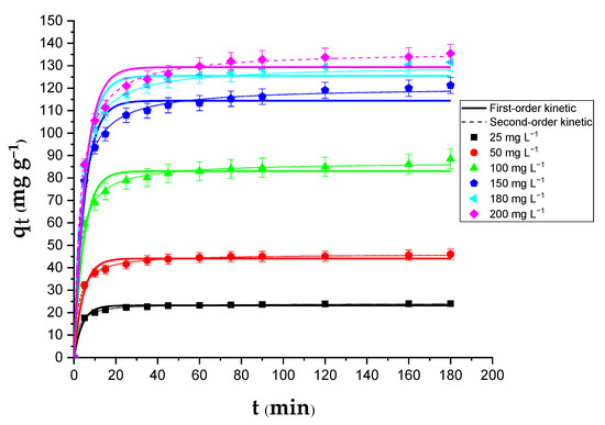 It is essential to examine adsorption kinetics in the treatment of aqueous effluent because it gives significant information about the effectiveness and mechanism of the adsorption process. The pseudo-first-order and pseudo-second-order models [47,48] were applied to the experimental data. The nonlinear forms of pseudo-first and pseudo-second order models are given as follows (3)–(4):