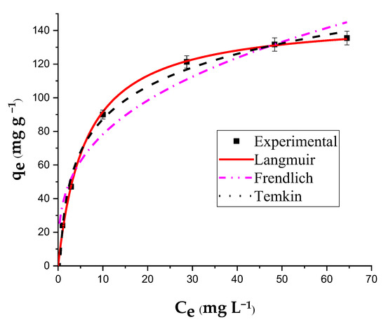The non-linear relationships of those isotherm models can be represented by the expressions reported in Equations (5)–(7) [47,49]:
