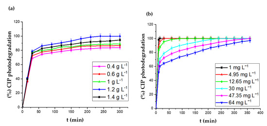 Figure 8a illustrates the photodegradation rate of CIP (C0r = 30 mg L–1) in the presence of various dosages of TiO2 (0.4–1.4 g L–1). When the photocatalyst dose was increased from 0.4 to 1.2 g L–1, the photodegradation efficiency of CIP increased from 84 to ~100%. Subsequently, a minor decline was noticed when an additional catalyst was introduced. This is because the number of photoactive sites for CIP oxidation increased, and the photocatalytic activity increased at 1.2 g L−1. The decrease in photoactivity was due to the opacity of the suspension, turbidity, and light scattering of the catalyst particles. The shadowing effect and the blocking and dispersion of incident light by excess TiO2 particles also contribute to the decreased performance [36]. All of these conditions would reduce the UV light intensity on the surface of the catalyst, hence decreasing the photodegradation efficiency.
