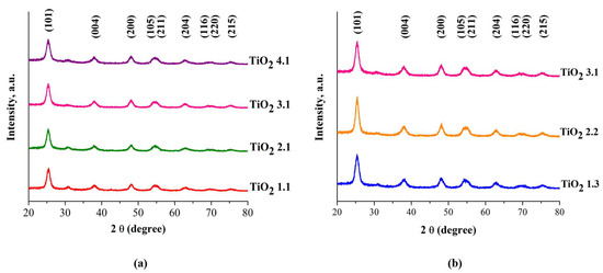 The structural characteristics of the synthesized samples were investigated on a Bruker-AXS: D8 ADVANCE Diffractometer (Bruker AXS, Karlsruhe, Germany) using copper radiation (). X-ray diffraction patterns were registered on the synthesized TiO2 powders in the range of , using a scanning step of . The crystallite sizes were calculated using the Scherrer equation [43]: