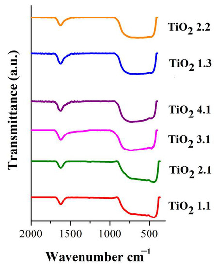 The surface chemistry of analyzed materials was investigated with FTIR spectroscopy. The FTIR spectra were obtained on a Bruker Vertex 70v FTIR spectrometer (Bruker Optics, Leipzig, Germany) at room temperature with a resolution of 2 cm−1 in the range of 4000–400 cm−1. All TiO2 samples have been analyzed by KBr method.