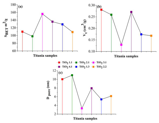 Besides, the nitrogen adsorption isotherms allowed us to calculate the BET-specific surface area (SBET), total pore volume (Vt), and mean pore diameter (dpore) which values are summarized in Table 2. As expected, by applying different ultrasonication regimes during the synthesis of titania, an achievement of distinctive textural features is observed. Thus, Figure 4a reveals that the BET-specific surface area (SBET) of the synthesized catalysts varies as follows: TiO2 3.1 > TiO2 4.1 > TiO2 1.3 > TiO2 1.1 > TiO2 2.2 > TiO2 2.1, being 2–3 times greater that the specific surface area of commercial titania (P25) [21]. Furthermore, it is worth mentioning that by increasing the ultrasonication time (on cycle) and by keeping the lowest break time (off cycle), as in the case of TiO2 3.1 and TiO2 4.1 titania samples, it is possible to achieve the highest values for SBET of 156 and 136 m2/g, respectively, meaning that the used regimes are favorable for high surface area titania. This can be explained by the ultrasonication on/off cycle advantage for the nucleation of the particles in the sol-gel mixture [30]. Moreover, the total pore volume (Figure 4b) and the mean pore diameter (Figure 4c) follow the same trend, TiO2 3.1 sample exhibiting the lowest values for the two parameters. Therefore, the obtained data indicate that by increasing the time for “off-cycle” in the ultrasonication regime a decrease in the mean pore diameter of the prepared titania nanomaterials, namely TiO2 1.3 and TiO2 2.2, could be observed. At the same time, the specific surface area for these two materials seems to be still high, concerning TiO2 1.1 and TiO2 2.1 samples. Results provide that textural characteristics of mesoporous titania could be controlled by applying different ultrasonication regimes. Compared with literature reports [11,31] the textural features represent an advantage for the photocatalytic process.