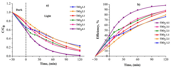 The effect of the ultrasonication regime used in the sol-gel synthesis of titania nanomaterials was also investigated from a photocatalytic point of view, of course following highlighted TiO2 characteristics. For that, the photocatalytic performance of the synthesized titania samples in the CR degradation was evaluated. For clarity, CR photolysis was negligible under the used experimental conditions. Accordingly, the obtained results were plotted and shown in Figure 7a, where the C/C0 ratio of CR dye vs. time was monitored. As observed, before each photocatalytic test the CR solution was left in contact with the titania samples for 30 min in the dark conditions to achieve the adsorption equilibrium. It was found that an adsorption potential of 40% is proper for the TiO2 4.1 sample, which is higher than that of the rest of the synthesized samples. According to SEM and BET results, the particles seem to be more dispersed as they exhibit a larger specific surface area, providing more sites for the adsorption process. Further, as observed from Figure 7b, it is notable to mention that the photodegradation efficiency of the TiO2 4.1 sample in the CR degradation process was (96%) after only 90 min, and reached about 98.28% at a further 30 min. Thereby, the best efficiency for photocatalytic removal of CR dye was found to be given by TiO2 4.1 which can be explained in terms of favorable textural parameters (specific surface, total pore volume, and pore diameter) that are greater when compared with other as-synthesized TiO2 samples.