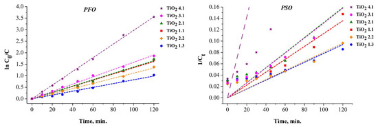During the photocatalytic process, the concentration of CR dye was monitored and the results obtained were plotted vs. time and presented in Figure 8. To describe the rate of the decomposition reaction of CR dye over synthesized titania photocatalysts, all experiments were performed under pseudo-first-order (PFO) and pseudo-second-order (PSO) conditions. In this regard, the experimental data characterizing the degradation reaction of CR dye, considering concentration and its variation in time, were fitted first to PFO kinetic model, those that have been expressed as:
