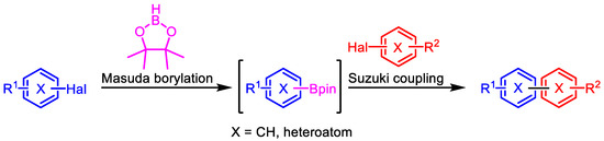 Organic synthesis is steadily challenged with respect to efficiency and selectivity, both for ecological and economic reasons. One approach to address the theoretical concept of an “ideal synthesis” is the development of one-pot processes where several reaction steps are conducted in the same vessel without the isolation of intermediates, therefore reducing solvents and waste, also due to less purification operation and, thus, saving time and resources [28,29]. Due to the similarities between Suzuki coupling and Masuda borylation with respect to reaction conditions, such as palladium catalyst systems and employed solvents and bases, linking both reactions into a one-pot sequence was obvious (Figure 3). As a consequence, the Masuda borylation–Suzuki coupling (MBSC) sequence formally represents a catalytic cross-coupling of two (hetero)aryl halides employing pinacolyl borane as the formal reductant.