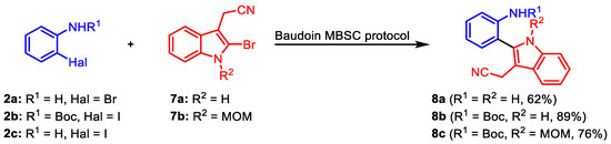 In the study of synthetic routes to seven- or eight-membered biphenyl and 2-phenylindole lactams as potential kinase inhibitors, Baudoin et al. were able to employ heterocyclic halide substrates in the MBSC sequence for the first time using their standard protocol (Figure 7) [35].