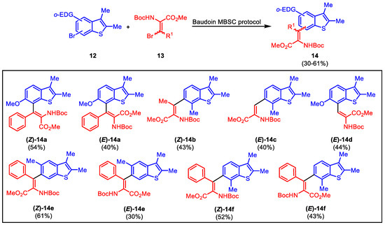 Later, the synthesis of benzo[b]thienyldehydroamino acid esters 14 was approached. Starting from ortho-methyl- or ortho-methoxy-substituted bromobenzo[b]thiophenes 12, after borylation, the subsequent Suzuki step was performed using β-bromo dehydroamino acid esters 13. Thereby, Queiroz succeeded in extending the MBSC sequence to non-aromatic substrates. The regiochemistry of the starting material was strictly maintained. The group synthesized nine E- and Z-configurated benzo[b]thienyldehydroamino acids with yields ranging from 30 to 61% (Figure 10). The compounds were tested for their antimicrobial and fluorescence properties and showed activity against Gram-positive bacteria B. cereus and B subtilis. The luminescent derivatives might also be used as fluorescent probes [36,37].