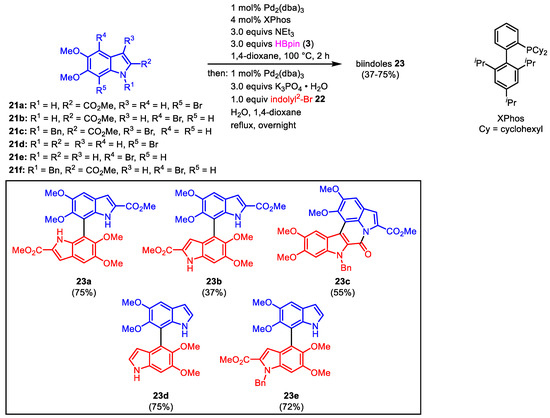 Chai and Huleatt focused on the homo- and hetero-dimerization of sterically congested indoles. To avoid the need to isolate the boronic acid ester intermediates, Chai et al. attempted to perform the dimerization in a one-pot process. For the Masuda borylation step, the group was successful with small loadings of tris(dibenzylideneacetone)dipalladium(0), although the addition of sterically hindered phosphane ligand dicyclohexyl[2′,4′,6′-tris(propan-2-yl)[1,1′-biphenyl]-2-yl]phosphane (XPhos) was required. Additionally, for the Suzuki coupling step, a new catalyst loading was needed. With their MBSC protocol, five examples have been synthesized in yields ranging from 37 to 75% (Figure 14). In the case of compound 23c, an in situ lactamization occurred to give the pentacyclic compound.