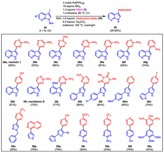 Encouraged by successful Masuda borylations of electron-rich bromo phenothiazines in 2002 [43], the Müller group later set out to develop a general MBSC protocol. In 2011, Merkul et al. could improve the MBSC methodology to the efficient coupling of readily available heterocyclic halides with simple catalyst systems and no need for exotic ligands, as previously observed by Levacher [40]. Furthermore, the reaction sequence is performed in the sense of a sequential Pd-catalyzed one-pot process, hence no addition of further catalyst loading is required for the concluding Suzuki coupling step. They envisioned a simple one-pot process to address pharmaceutically promising scaffolds, among them meriolins, which are potent kinase inhibitors [44,45,46,47]. Merkul et al. exemplified the tolerance of several functional groups and different six-membered aryl substituents and both hetero iodides and bromides, as well as chlorides, as substrates for the Suzuki step. As the electron-rich component for the Masuda borylation step, N-Boc-protected (7-aza)indoles, pyrroles, and other five-membered ring iodides 24 have been employed. The Boc protection group is cleaved under the Suzuki conditions; therefore, no additional deprotection step is required. Starting from iodides 24, the Masuda borylation step is performed with low catalyst loading. Then, the heteroaryl halide 25 for the Suzuki coupling step is added in a strictly equimolar loading. In this first publication, 21 examples with yields ranging from 35 to 92% have been synthesized (Figure 15). The general protocol was employed in the concise synthesis of natural product meridianin G (26i) and natural product precursor O-methyl meridianin A (26j). Meridianin A was readily obtained through demethylation [31].