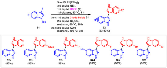 Tasch et al. discovered that, in some cases, the concomitant Boc-cleavage significantly affects the Suzuki coupling, especially if the reaction rate is lower than the base-mediated deprotection. This led to the consideration that the Boc-protecting group should be replaced with the more robust tosyl protection group. A short catalyst screening showed that the standard protocol without the addition of ligands gave the best results. The tosyl-deprotection step could easily be implemented as a third step in the one-pot process. These reaction conditions were employed to synthesize the symmetrically and unsymmetrically substituted 3,3′-biindoles 32 in yields ranging from 33 to 83% (Figure 19).