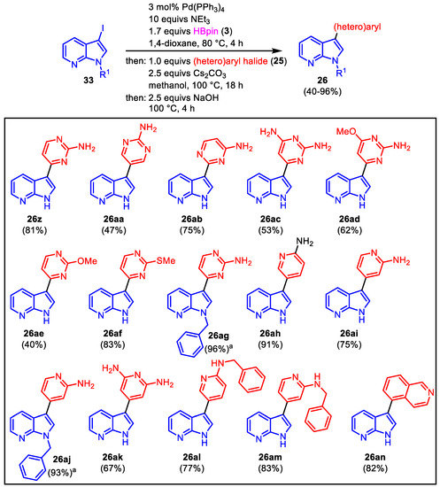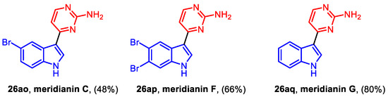 The usage of N-tosyl-protected indoles 31 and azaindoles 33 became the standard procedure, as it allows better control of the reaction sequence. Natural products meridianins C (26ao), F (26ap), and G (26aq) have been synthesized using the latter protocol in subsequent publications by Kruppa et al. (Figure 21) [49].
