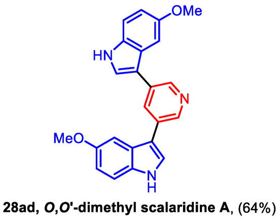 This protocol could later be adapted by Kruppa et al. in the synthesis of naturally occurring pyridine-bridged bisindole scalaridine A via the O,O′-dimethyl precursor 28ad in 64% yield (Figure 23) [49].