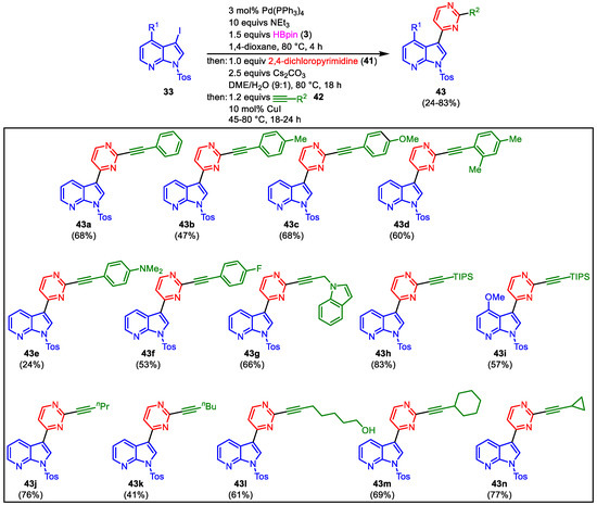 Another possible extension of the MBSC sequence was shown by Drießen et al. The initial MBSC protocol for meriolin derivatives 26 starting from N-tosyl-7-azaindoles 33 could successfully be expanded through a Sonogashira reaction, therefore concatenating three sequentially palladium-catalyzed processes—a borylation, a heteroarylation, and an alkynylation. It is noteworthy that only catalytic amounts of copper iodides needed to be added for the concluding Sonogashira coupling, whereas no additional amounts of palladium catalyst or triethylamine were required. To diminish nucleophilic side reactions between the solvent and 2,4-dichloropyrimidine, the solvent was changed from the initial alcoholic carbonate solution (methanol/cesium carbonate) to a mixture of 1,2-dimethoxyethane and water. Aromatic and aliphatic alkynes 42 were employed as Sonogashira coupling partners. This led to fourteen examples of alkynylated meriolin derivatives 43 with yields ranging from 24 to 83% (Figure 26). Selected derivatives have been experimentally and computationally investigated for their photophysical properties [55].