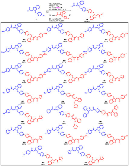 In the course of their studies on aroyl-S,N-ketene acetals (ASNK) with tunable solid-state emission and aggregation-induced aggregation (AIE), Biesen et al. were able to extend their parental system of AIEgens to biphenylene-bridged bisaroyl-S,N-ketene acetals 48. For the reaction, the standard MBSC protocol was suitable, though with a slightly higher palladium catalyst loading of 10 mol%. Starting with the bromo ASNK with electron-donating substituents, a Masuda borylation step is performed before the second bromo ASNK is equimolarly added for the concluding Suzuki coupling step, which furnished twenty examples of bisaroyl-S,N-ketene acetals 48 in yields ranging from 30 to 98% (Figure 28).