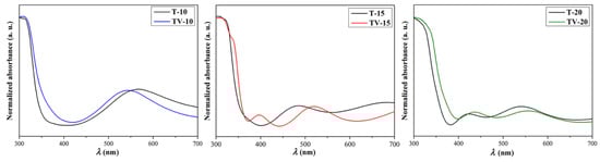 The chemical compositions of the samples are listed in Table 2 obtained by XPS. The positions of the O 1s peaks in TV samples were shifted towards higher values of the binding energy (by ≤ 0.2 eV), compared to the T-samples. The vanadium peak is observed only in samples on which vanadium oxide is deposited. The binding energy for V 2p3/2 is in the range 517.0–517.2 eV, while the values for V 2p1/2 are in the range 524.3–524.8 eV. The positions of the V 2p peaks correspond to the vanadium (V) state, indicating that the vanadium (IV) in the precursor oxidized after drying at 100 °C in air []. TV-10 and TV-15 contained the same concentration of vanadium, while the vanadium content was lower in TV-20 (Table 2).