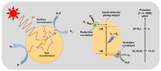 In general, POWS involves three main steps (Figure 1): (1) A photon with energy greater than the bandgap energy of the photocatalytic semiconductor is absorbed by the semiconductor, and excites an electron from the valence band to the conduction band, leaving a hole in the valence band. Such electrons and holes are referred to as photogenerated electron-hole pairs or photogenerated carriers. Since photo-generation of electrons/holes relies on excitation of the semiconductor with light irradiation, photocatalysts with a wide range of light responses and good light absorption coefficient should be developed, which could be realized by tailing modification of photocatalysts via doping or solid-solution construction [20]. (2) Photogenerated carriers separate and migrate towards the surface redox-active sites. During the migration process of carriers to the surface of the photocatalyst, some electrons and holes will recombine, and only the electrons and holes that successfully reach the redox-active sites can participate in the redox reaction. As such, accelerated charge separation should be realized via building hetero/homo-junctions [15,21]. (3) Photogenerated carriers reaching the redox-active sites are consumed in the process of photocatalytic hydrogen and oxygen production. Due to the high activation energy of water splitting, not all the photogenerated carriers reaching the photocatalyst surface could participate in the water splitting reaction timely, which, consequently, results in surface recombination, finally greatly limiting the efficiency of POWS [22,23]. Therefore, various strategies, including loading cocatalysts, have been employed to boost the surface redox reaction.