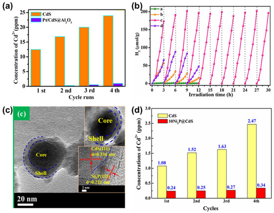 (a) The cadmium ion concentration changes in the solution of CdS NPs and Pt/CdS@Al2O3 composite with light irradiation time (b) Cycling runs for the photocatalytic hydrogen evolution activity under visible light over various samples: (a) CdS NPs, (b) Pt/CdS, (c) Pt/CdS@Al2O3 with artificial gill and (d) Pt/CdS@Al2O3 without artificial gill. (a,b) Reproduced with permission from Ref. [112]. Copyright 2018, Elsevier. (c) HRTEM images of 10Ni2P@CdS and 1Pt@CdS. (d) The concentration of Cd2+ for each run in the reaction solution of CdS and 10Ni2P@CdS under visible light irradiation. (c,d) Reproduced with permission from Ref. [62]. Copyright 2018, Elsevier.
