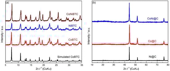 Pxrd of (a) CoNiBTC, CoBTC, and NiBTC; (b) CoNi@C, Ni@C, and Co@C.