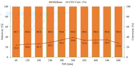 The methanation of CO2 was performed using a fixed bed reactor (PID Microactivity-Effi reactor) at 375 °C and 30 bar. An Inconel reactor tube with an internal diameter of 8 mm was used to host the reaction. The catalyst sample (200 mg) was pelletized in a pellet size of 100–300 microns and then loaded in between two layers of quartz wool inside the reactor tube. The sample was preheated at a ramping rate of 15 °C/min to 550 °C under a continuous flow of N2 gas (20 mL/min) for 30 min. After that, the sample was reduced under H2 (3 mL/min) and N2 (20 mL/min) flow for another 30 min. After the reduction, the sample was cooled down to 70 °C, pressurized with the reactant feed to 30 bar, and then heated to reaction temperature (375 °C) to carry on the reaction. The reactant feed was a mixture of CO2 and H2 with an H2 to CO2 ratio of three, and the feed flow rate was kept at 15 mL/min with gas hourly space velocity (GHSV) of 4500 mL/(g·h−1). The quantitative and qualitative analysis was performed using gas chromatography (Shimadzu, Kyoto, Japan, GC-2014) equipped with one thermal conductivity detector (TCD) and one flammable ionization detector (FID).