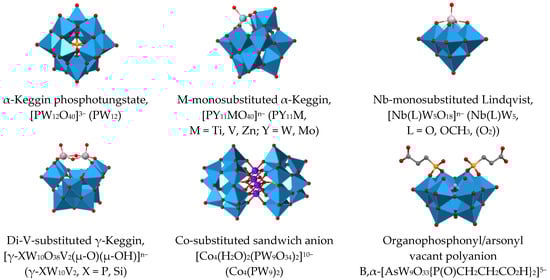 The solubility, redox, and acid–base properties of POMs and, as a result, their catalytic performance can be finely tuned by choosing the POM structure and chemical composition of both the polyanion and its counter cations. In particular, interesting objects for oxidation catalysis are M-substituted polyoxotungstates that comprise various heterometals (M) strongly bound to the molecular tungsten oxide through multiple M–O–W bonds, which potentially prevents the active site from hydrolysis and di(oligo)merization. In addition, a covalent functionalization of POMs can be used to control the surrounding of the active site, specifically its steric hindrance [46,47]. Some structural types of POMs that will be mentioned in this review, in relation to their use in oxidation catalysis with H2O2, are shown in Figure 1.
