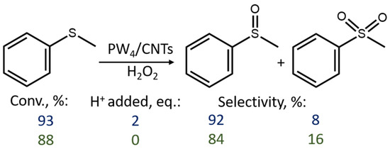 - Evtushok, V.Y.; Ivanchikova, I.D.; Podyacheva, O.Y.; Stonkus, O.A.; Suboch, A.N.; Chesalov, Y.A.; Zalomaeva, O.V.; Kholdeeva, O.A. Carbon Nanotubes modified by Venturello complex as highly efficient catalysts for alkene and thioethers oxidation with hydrogen peroxide. Front. Chem. 2019, 7, 858. [Google Scholar] [CrossRef]