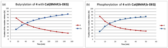 13], also in the acylation reaction, the BMAP-type catalysts were much more active than the imidazole-type analogues. Furthermore, it is evident that, both in acylation and in phosphorylation catalysis and for both catalytic families, the ortho-alkoxy groups on the benzyl substituent of the nitrogen augment the catalyst activity. It seems that the augmenting effect of these groups is much stronger for the phosphorylation reaction, compared to the acylation, and somewhat stronger in the case of the BMAP family of catalysts, compared to the Im family. On the other hand, while the effect of these groups derived from oligoethers is visibly stronger than that of those derived from alkanes, this difference is more pronounced in the case of the Im series. Finally, the comparison between the two reactions within the series of experiments with BMAP-type catalysts reveals that, as already abovementioned, the phosphorylation reaction is faster than the acylation reaction under the indicated conditions. It was observed that, in the case of phosphorylation, lack of the auxiliary base (DIPEA) prevents the reaction progress almost completely [