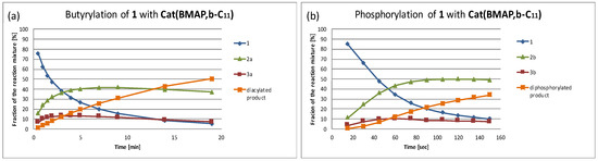 Regarding the site selectivity of the transformations, the more important of the investigated catalyst characteristics, profound effects of the catalyst structure on this parameter were observed. The effects were notably different for the two examined reactions. In the case of phosphorylation, the ortho-alkoxy substituents on the benzyl moiety increased the tendency of the first functionalization to occur at the apolar site (thus forming the product 2b), compared to substituent-less reference catalysts BnIm and BMAP, almost regardless of the nature of this substituents. While in the case of imidazole-based catalysts, better selectivity was obtained with the catalysts with oligoether-derived substituents and slightly lower with the hydrocarbon-derived appendages, in the case of BMAP-including catalysts both the hydrocarbon- and tri(ethylene glycol)-derived substituents on the benzyl moiety imparted superior (almost equivalent) selectivities. In the case of acylation, however, for both catalytic series, the presence of hydrocarbon-derived alkoxy groups on the benzylic moiety of the catalyst improved the apolar site-favoring selectivity compared to the substituent-less reference catalysts (though only modestly), while the presence of oligoether derived substituents did not affect or was even detrimental to this critical parameter. To our disappointment, in acylation experiments, the most selective catalyst of the BMAP family, Cat(BMAP,b-C11), was only marginally better, selectivity-wise, than its analogue of the Im family or even the benchmark DMAP catalyst.