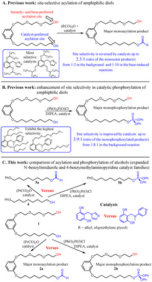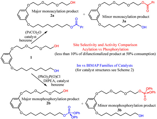 11]. We also found that a catalyst of a family closely related to the said imidazole-based catalysts, which bears peripheral oligoether rather than hydrocarbon tails, imposes enhanced apolar site-favoring selectivity in a related phosphorylation of amphiphilic diols [