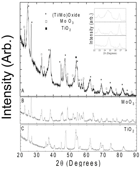Figure 3 shows the XRD patterns of Ti-Mo NC which are different from the pure oxides. TiO2 powder consists of both anatase and rutile phases. Constituent MoO3 also exhibited a spectrum in line with previously reported high-purity phases. In the panel A of Figure 3, we marked all possible peaks assigned to TiO2 and MoO3. One of the noticeable features in the obtained spectrum is the peak broadening, which can be indicative of the nanocomposite formation. One such example of successful nanocomposite formation is shown in the inset of Figure 3. The (111) peak of MoO3 at 2θ = 25.13° overlaps with the (101) anatase peak of TiO2 at 2θ = 24.68°. The full-width half maximum of the nanocomposite peak is approximately doubled relative to the pure oxides. Such peak merging occurs at all angles marked with (*) in the spectrum. In conclusion, the obtained XRD data reveal a uniform high-quality nanocomposite.