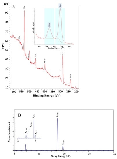 Surface analyses for Ti-Mo NC (A) XPS and (B) XRF spectra.