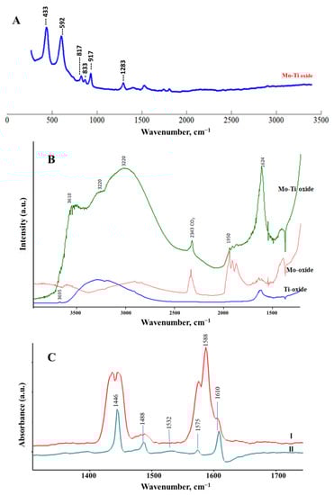 Pyridine is a commonly used probe to classify the adsorption sites on metal oxides [39,40,41]. In brief, the C=C and C=N adsorption modes are sensitive to the mode of attraction between pyridine and the acidic sites on the metal oxide surfaces. Figure 5C shows the FTIR spectra of the Ti-Mo NC in the presence of pyridine vapor (curve I) and after evacuation for 2 min (curve II). As shown in Figure 5C (II), the adsorbed pyridine possesses IR bands at 1610 cm−1, 1575 cm−1, 1532 cm−1, 1488 cm−1, and 1446 cm−1. The band appearing at 1610 cm−1 indicates water strongly bound to the surface. The bands at 1575 cm−1, 1488 cm−1, and 1446 cm−1 are assigned for pyridine coordination to the Lewis acidic sites [39,40]. Finally, the weak absorption mode appearing at 1532 cm−1 is aligned to the pyridinium ion formation vis surface hydroxyl modes (BrØnsted acidic sites) [39,40,41]. Given the relative band intensities presented in Figure 5C-II, it clearly shows both the water adsorbed moieties and the Lewis acid sites dominating the surface sensitivities through the observed adsorption behaviors, as presented in the following sections.