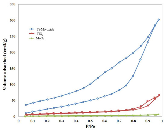 Nitrogen adsorption and desorption isotherms were measured for the pure oxides and the nanocomposite, as shown in Figure 6. The adsorption isotherms for all measured samples follow type V. The nitrogen uptake for pure TiO2 is higher than that of pure MoO3 at various relative pressures. When compared with the pure metal oxides, the nitrogen uptake of Ti-Mo NC was higher over the whole adsorption range with a steep uptake at relative pressures greater than 0.8.
