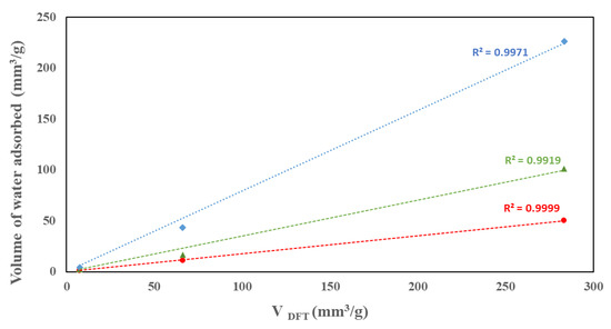 Correlation between the volumes of water adsorbed at different relative pressures and the total pore volume.