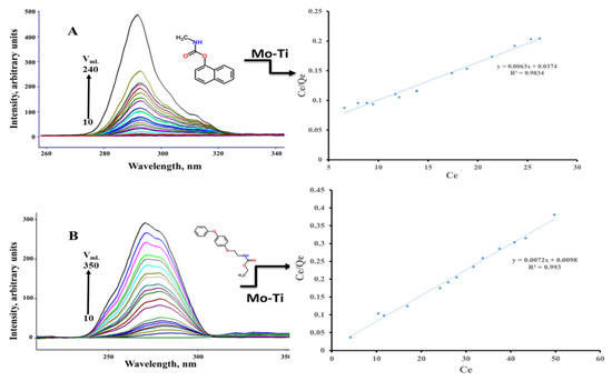 The adsorption and photocatalytic properties of the nanocomposite were studied using carbaryl and fenoxycarb insecticides and MB dye. Both carbaryl and fenoxycarb compounds exhibit emission bands due to the intense π-π* transition that the pesticide emits at the given energy. When fenoxycarb was excited at 270 nm, it produced an emission band at 321 nm. Carbaryl, on the other hand, emits strongly at 330 nm when excited at 276 nm. Herein, we used synchronous scan luminescence spectroscopy (SSLS) to monitor the adsorbed amount under the optimized conditions. In the SSLS, both excitation and emission wavelengths were changed at a constant wavelength difference [45]. Figure 10 shows the SSLS (with ∆λ = 50 nm) of the 60 ppm carbaryl and fenoxycarb pesticide solutions before and after mixing various volumes with 50 mg of Ti-Mo NC for 5 min. As shown in Figure 10, the emission intensity of the pesticide solutions decreased as the relative amount of Ti-Mo NC in the solution increased; hence, the number of adsorbed molecules increased.