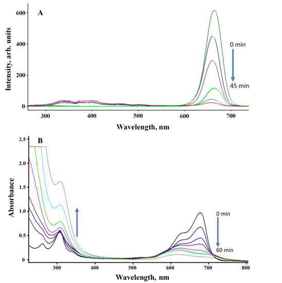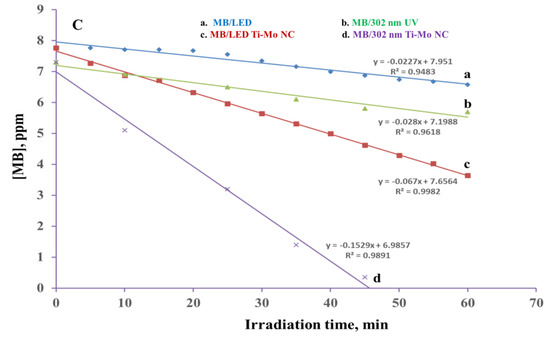 The MB was irradiated with 302 nm UV and white LED irradiation sources in the presence and absence of the Ti-Mo NC catalyst for various durations and monitored via SSLS and UV-visible spectroscopy. As shown in Figure 11 (A), the SSLS band at 680 nm possesses a clear and gradual reduction upon irradiation with a 302 nm UV light for various periods with no indication of the formation of any new luminescent product(s). A similar result is shown in Figure 11 (B) where the UV profiles illustrate a gradual reduction in the MB broad absorption band between 580–600 nm, but the degradation is associated with a clear and strong enhancement in the absorption that occurs in the UV region. This indicates the degradation of MB to less conjugated product(s) that are not emissive as confirmed by the identified products as illustrated in Scheme 1. The plot of [MB] versus irradiation time(s) revealed a zero-order rate, as shown in Figure 11 (C). The photodegradation rate constant of irradiated MB under 75 W LED white light in the absence of a catalyst was 0.0227 s−1 ppm, but the photodegradation rate constant of MB irradiated in the presence of Ti-Mo NC was 0.067 s−1 ppm, showing a threefold increase in the photodegradation. Further, the use of 302 nm UV as the irradiation source demonstrated a clear enhancement in the photodegradation rate where the measured rate constants are 0.028 s−1 ppm and 0.1529 s−1 ppm, in the absence and presence of the Ti-Mo NC catalyst, respectively. The photodegradation of MB in the presence of the catalyst was doubled when the system was irradiated for 302 nm UV light compared with the LED white irradiation source.