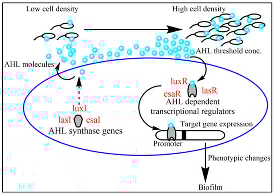 Mechanism of QS system in gram-negative bacteria involving AHL molecules.