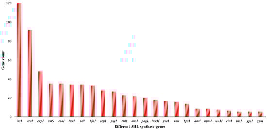 Number of organisms sharing an AHL synthase gene. The X-axis denotes the frequency of organisms in a particular AHL gene, and the Y-axis denotes the gene names for the AHL synthase present in those organisms. A brief description of the genes listed in Y-axis are provided in Table S1 [25,26,27,28,29,30,31,32,33,34,35,36,37,38,39,40,41,42,43,44,45,46,47,48,49,50].