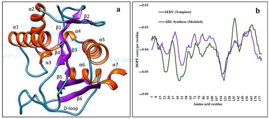 The identity, query coverage, and E-value of modelled AHL synthase structure with the PDB ID #6EDV were 50%, 96%, and 1.2 × 10−51, respectively. Thus, #6EDV was used as the template AHL synthase. Modeling of the AHL synthase structure from DvH resulted in 20 different models with different DOPE scores, but the same GA341 score (=1.0000). Amongst all AHL synthase models, the structure with the minimal DOPE (−20941.3925) and GA341 score of 1.0000 was taken as the best model. The energy-minimized structure and dope score per residue of AHL synthase are shown in Figure 3a,b, respectively. The DOPE score per residue was plotted against the amino acid position for both the template structure (#6EDV) and the protein model generated using Modeler. The DOPE score per residue demonstrates the geometrical stability of a specific region within the secondary structure of protein. The minimum DOPE score per residue of the modeled structure as compared to the template structure indicates more stability in the secondary structure.