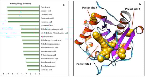 Binding energy and surface interactions between substrates and modeled AHL synthase. (a) Plot of binding energies between substrates and modeled AHL synthase, and (b) the surface interactions between the acyl substrate and modeled AHL synthase. The acyl chain substrate is shown as golden spheres.