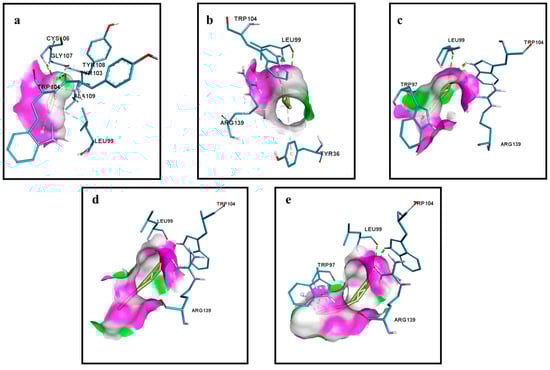 The docking interactions between the AHL synthase and unsubstituted AHLS. (a) C4-AHL, (b) C6-AHL, (c) C8-AHL, (d) C10-AHL, and (e) C12-AHL.