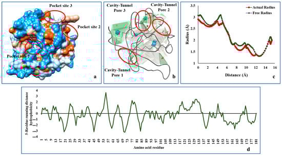 The hydrophobicity index of the amino acid residues of the modeled structure was analyzed using the Kyle and Doolittle algorithm in Discovery Studio (DS v20) [86]. The values of the hydrophobicity were plotted using ggplot2 package in R programming language, and the 5-Residue Moving Average Hydrophobicity curves were analyzed using the hydrophobicity chart in DSv20 to confirm the hydrophobic pockets within the modeled structure. The lengths of the tunnels and the depths of the cavities were determined using Mole v2.5.17.4.24 [87]. The interacting amino acid residues were selected, and the tunnels were evaluated by regulating the minimum bottleneck radius, pore, and length to 1.25 Å, 0 Å, and 0 Å, respectively. The cavities corresponding to each tunnel were found by setting the probe radius, and minimum depth to 8 Å, and 5 Å, respectively.