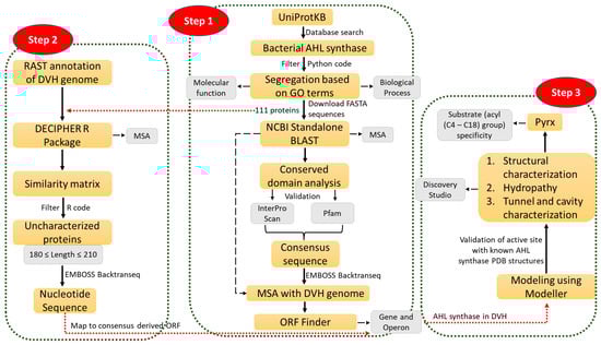 Multiple sequence alignment (MSA) using NCBI standalone BLAST was performed to align all the AHL synthases (amino acid sequences) for conserved domain analysis. The consensus sequence identified was then validated using InterPro Scan and Pfam databases [60,61]. European Molecular Biology Open Software Suite (EMBOSS) Backtranseq was used to reverse-translate the amino acid consensus sequence to nucleotide sequence [62]. MSA was then used to align the reverse-translated consensus sequence (nucleotides) to the DvH genome sequence (nucleotides). The open reading frame (ORF) aligned region in DvH genome was established using ORF finder tool in NCBI. The workflow summarizing the steps of consensus sequence-based ORF identification is depicted in Step 1 of Figure 7.